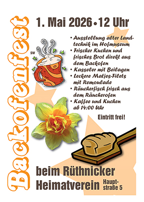 Viel Spaß beim Blättern auf unseren Seiten – wir würden uns freuen, wenn Sie beim nächsten Mal auch dabei sind, bei Backofenfest oder Theatervorstellung im Rüthnicker Heimatverein. Die Veranstaltungen finden zumeist in unserem Vereinshaus, Hauptstraße 5, in Rüthnick statt. Hier, wo früher die alte Schmiede war, haben die Mitglieder in Eigenregie ihr eigenes Vereinsheim geschaffen.